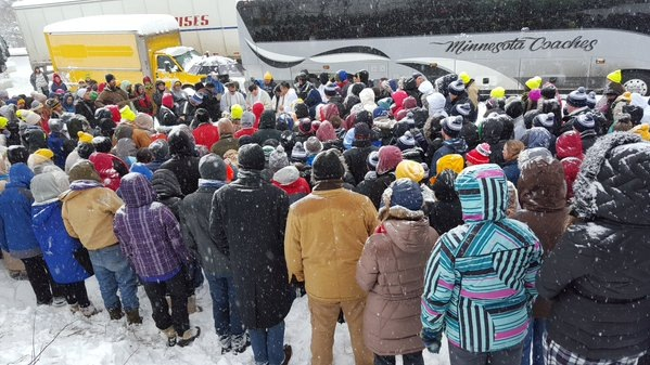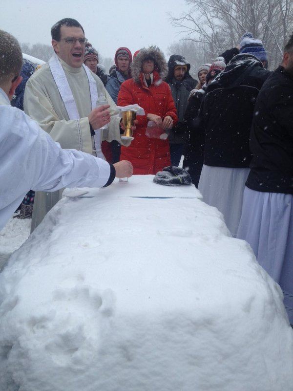 A huszonkét órás várakozás közben a fiatalok ötletszerűen építettek hóból egy oltárt, ahol Patrick atya főcelebrálásával szentmisét mutattak be. A mise és az oltárépítés ötlete a Saint Paul-Minneapolisi Érsekség (ASPM) zarándokaitól származott; nagy szerepet játszott benne Bill Dill, a helyi ifjúsági referens. A fiatalok végigjárták a buszokat, hogy a misére invitálják a hó fogságában rekedt sorstársaikat.